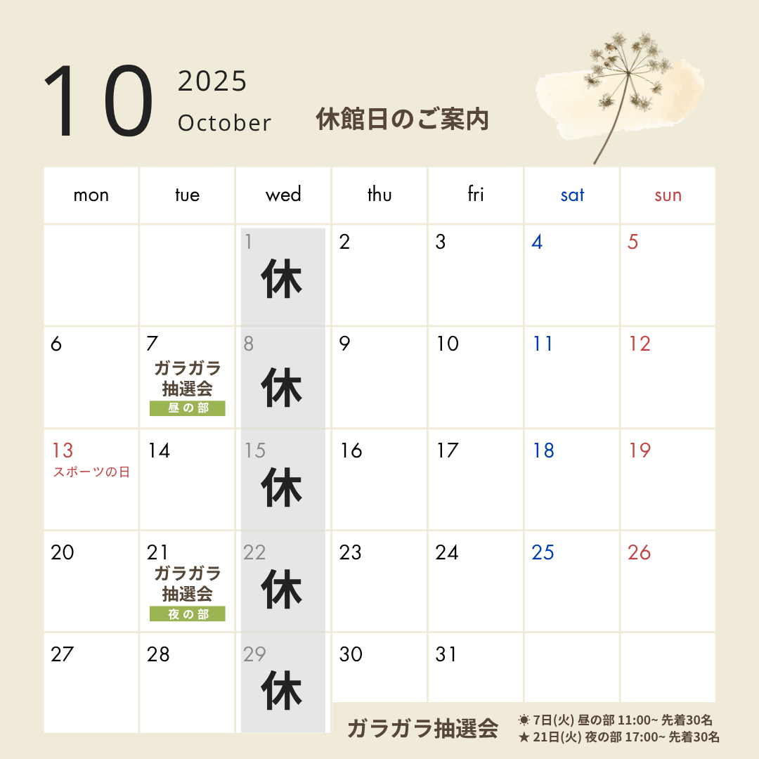 2025年10月の休館日のお知らせでございます。